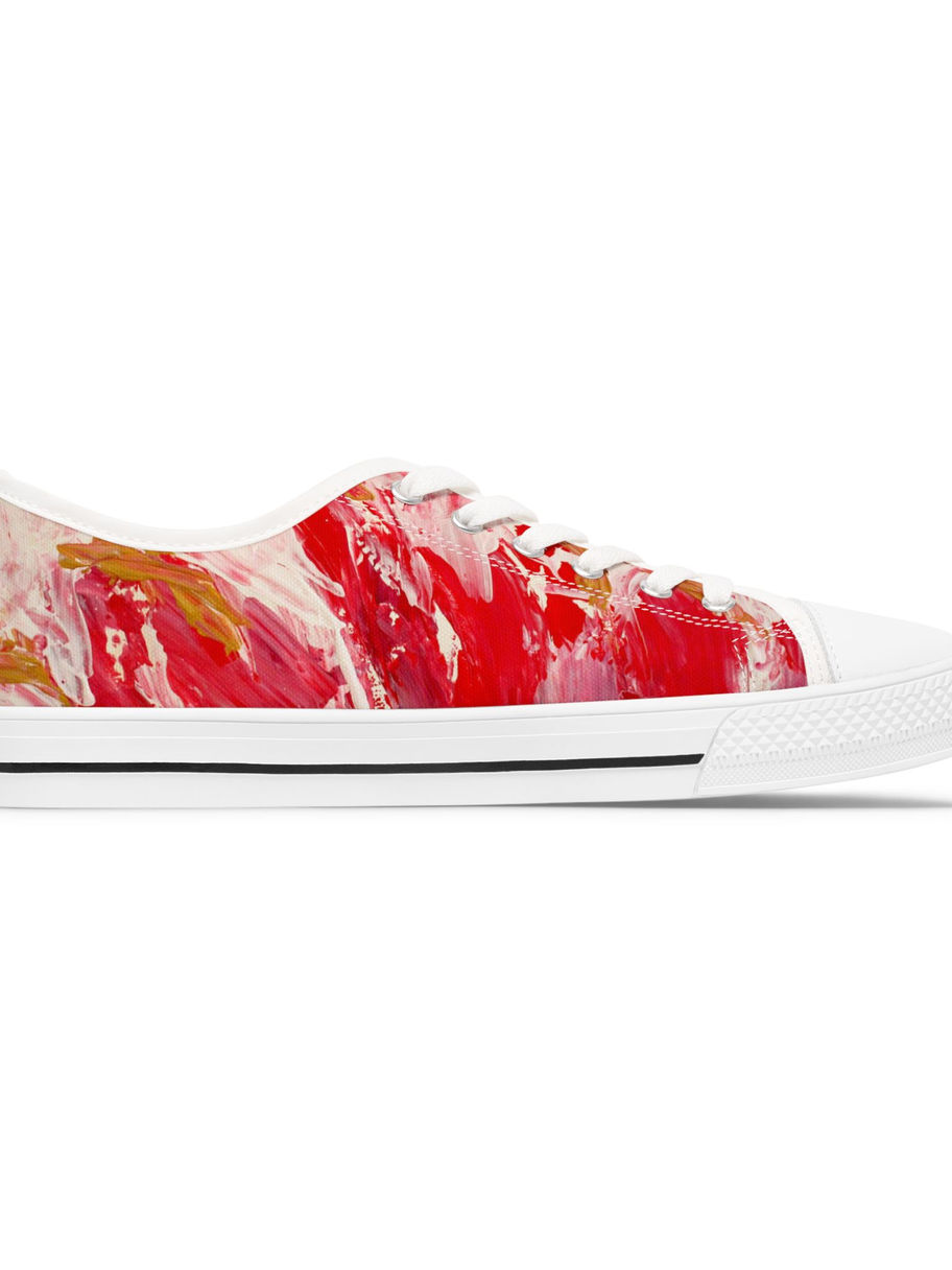 Made with breathable polyester canvas and featuring hi-poly deodorant memory foam insoles, these women's low top sneakers bear all the marks of an awesome shoe. The white sole and laces, and enjoy the silver metal eyelets along with the lace-up closure.