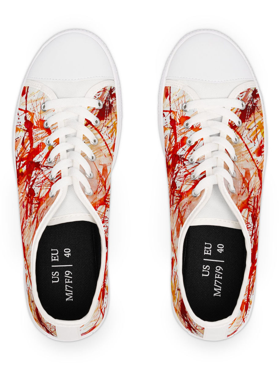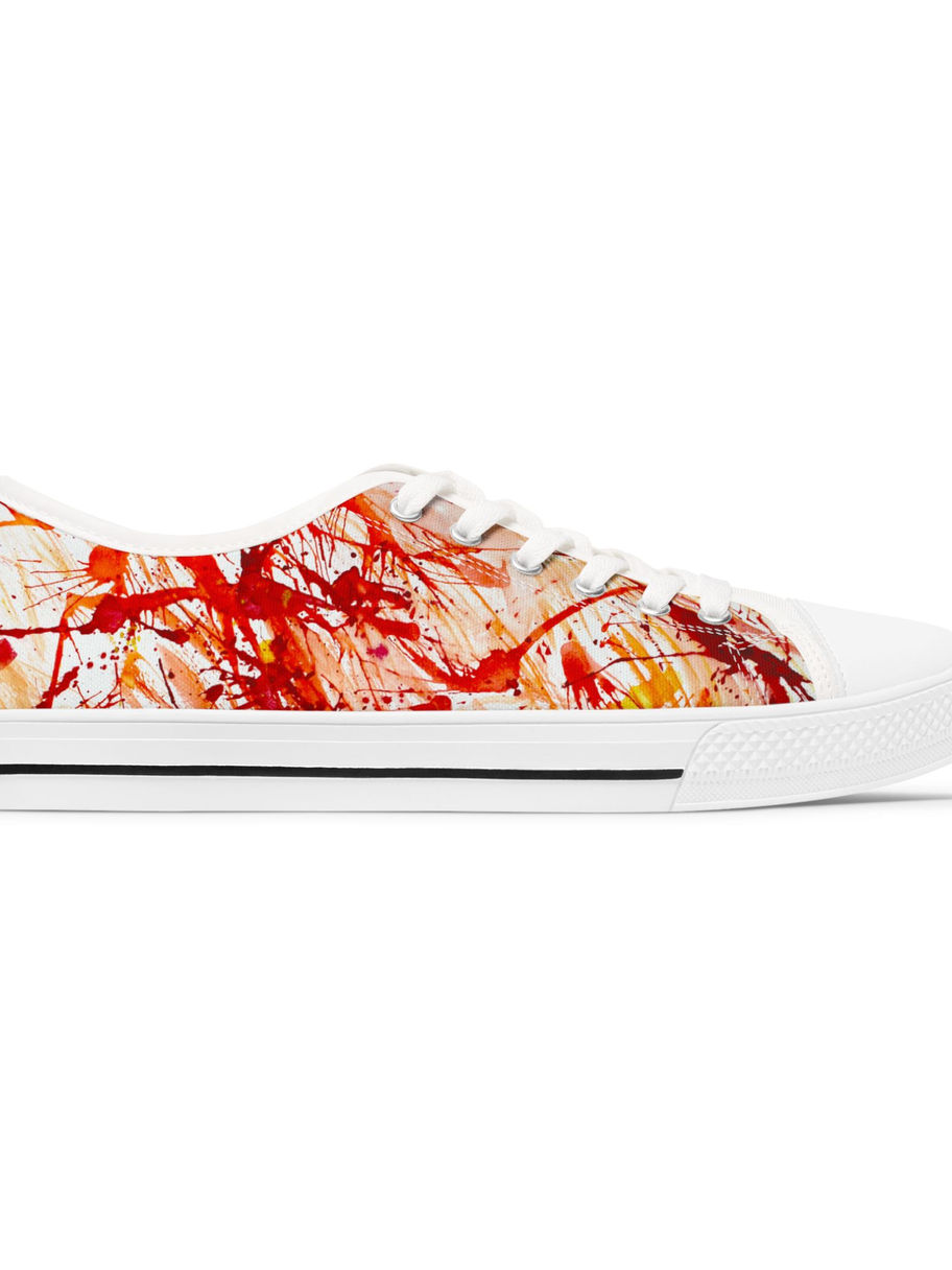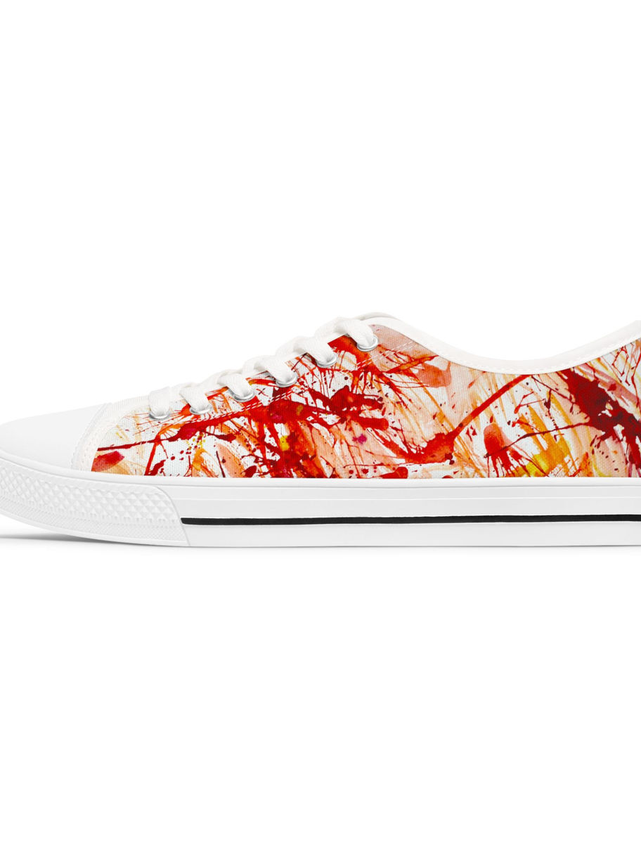 Ignite your wardrobe with the radiant energy of the watercolour splash women's low top sneaker. Crafted for those who love to express themselves boldly, this luxury sneaker features a breathable polyester canvas upper, accented with sleep PU leather for a refined finish. Enjoy exceptional comfort with hi-poly deodorant memory foam insoles and an EVA shock absorbing midsole, while the durable rubber outsole ensures every step is steady and stylish. With white soles and laces, complemented by polished silver metal eyelets and a classic lace-up closure.